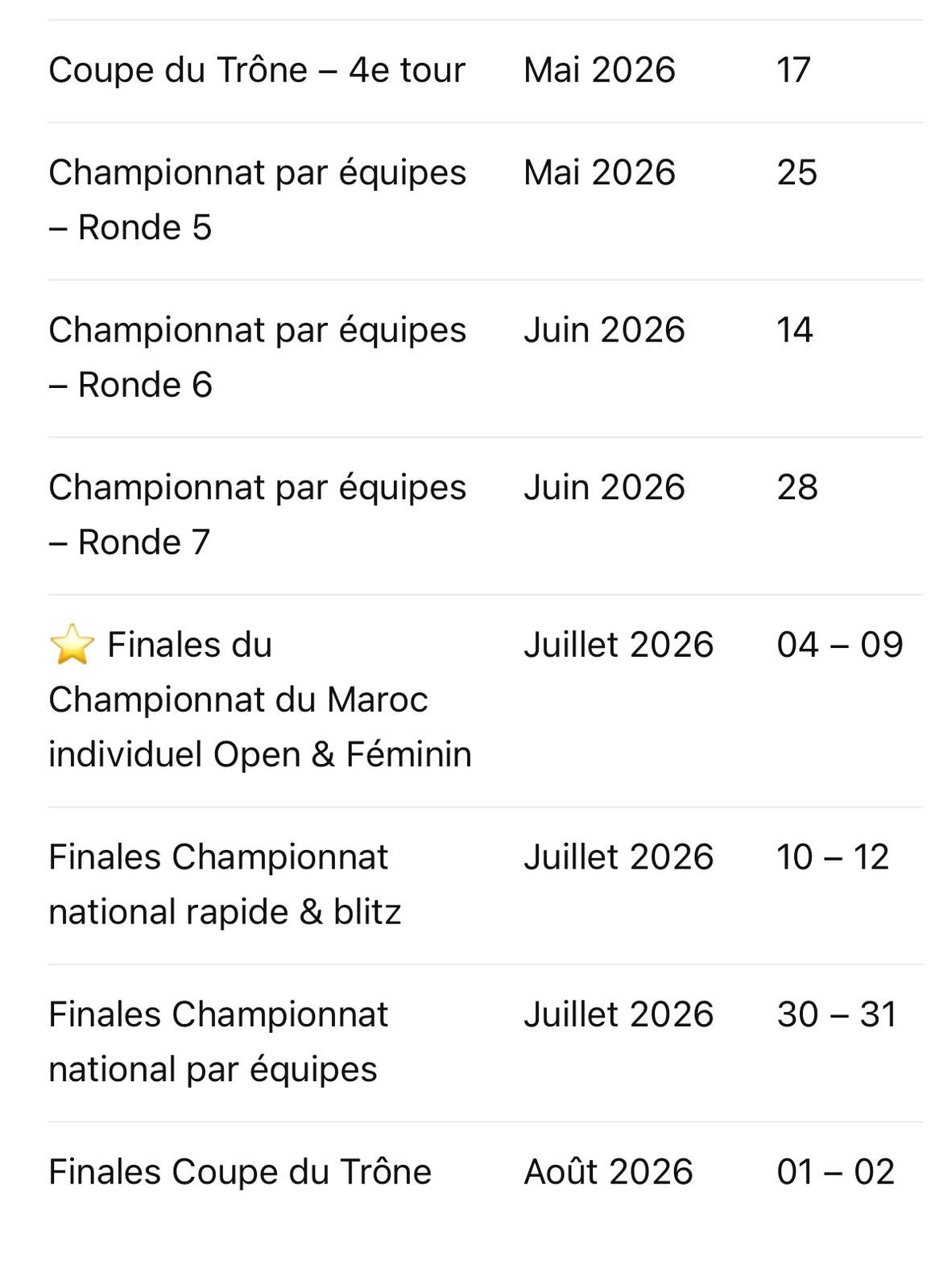 Point culminant de la saison, les finales du Championnat du Maroc individuel Open et Féminin se tiendront du 4 au 9 juillet 2026, suivies immédiatement par les finales du championnat national de rapide et blitz du 10 au 12 juillet.